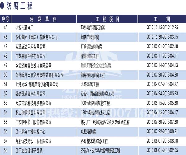 宏順建設(shè)工程有限公司是國家批準(zhǔn)成立的專業(yè)高空作業(yè)企業(yè):承攬過(國內(nèi).國外)煙囪新建、煙囪防腐、吊機防腐、水塔防腐、管道防腐、龍門吊防腐、儲存罐防腐、煙囪內(nèi)壁防腐等高空作業(yè)工程。具有“不搭腳手架 、 不需要停產(chǎn)”施工特點。
